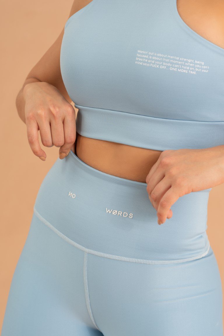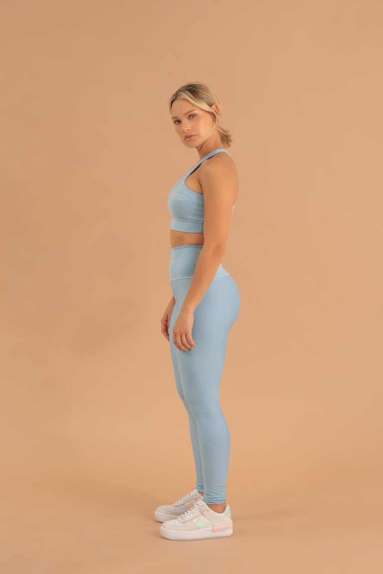 Leggings deportivos de mujer en color azul cielo, hechos de lycra elástica que se adapta a diferentes tipos de cuerpo, con una pretina de control abdominal y tecnología de compresión para mayor soporte en el abdomen. Fabricados con telas inteligentes de alta densidad y suaves para brindar comodidad durante el ejercicio y evitar transparencias incómodas al hacer sentadillas o flexiones. Perfectos para combinar con nuestro sujetador Cloud Light Blue o cualquiera de nuestros otros sujetadores.